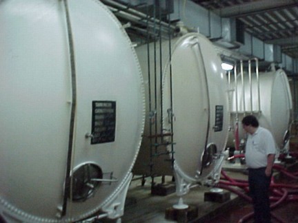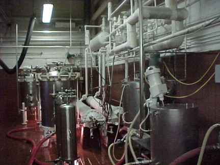 The third operation during the transfer is filtration. We remove yeast cells and precipitated proteinaceous materials by means of filtration through diatomaceous earth which acts as the filter aid. The filtered beer then passes from the filter to the secondary storage tank located in the secondary storage cellars. Here the temperature is maintained at 0°C (32°F).