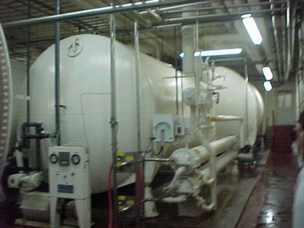 The temperature of the beer is also lowered to approximately -2 to 0°C (28-32°F). This process is accomplished via large shell and tube coolers. The beer flows through a pipe which is encased by a larger shell containing ammonia. Is this way, very exact temperatures are attained.