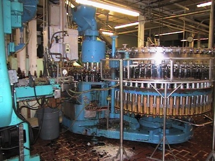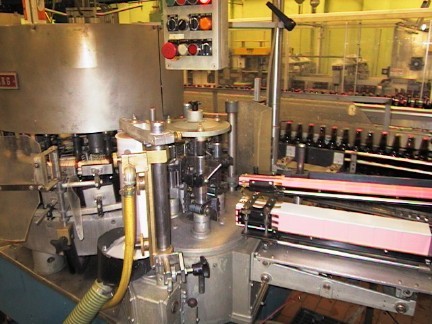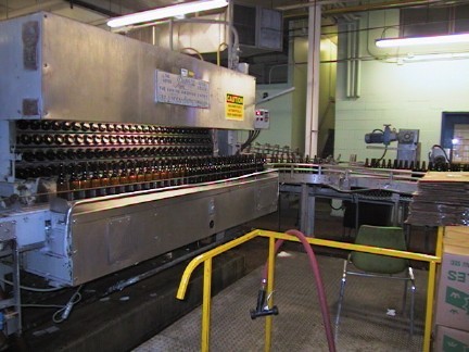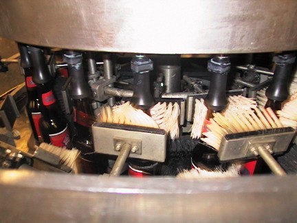 The bottles pass along a conveyor system from the soaker to a filling machine. Any dirty or chipped bottles are removed at one visual and two electronic sighting stations located between the soaker and filler.