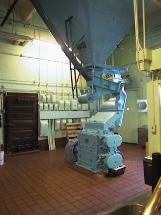 Approximately 1 kg (2.2 lbs.) of malt will produce 5 litres (1.1 gal.) of beer. In our plant, brew sizes vary from 175 hl (3850 gal.) [ 1 hl = 100 litres = 22 gals. ] to 210 hl (4620 gal.) The first step in producing a brew is the grinding of the whole malt. Attentive control is exercised in the use of whole malt and complete records are kept of the amount used per brew, for excise purposes.